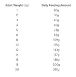 All recommended feeding amounts are in grams per day.
