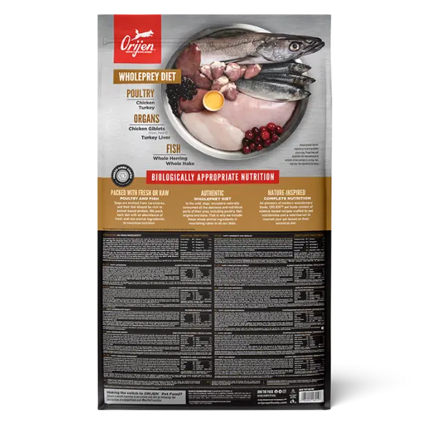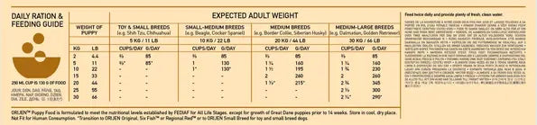 Embrace the boundless energy and mischief of your furry bundle with ORIJEN's tantalising blend of fresh free-run chicken and turkey, nest-laid eggs, and wild-caught fish – the perfect feast for every adventurous pup. As all pups embark on their journey of rapid growth and development, it's crucial to fuel their boundless curiosity with a diet packed full of proteins and fats from an array of fresh whole meats. With 38% protein to fuel their adventurous spirit and a mere 17% low-glycemic carbohydrates to keep those puppy pounds in check, ORIJEN delivers the perfect balance according to your pup's evolutionary blueprint. We're shaking up the puppy food game by ensuring 2/3 of our meats are fresh or raw, free from any pesky preservatives, and featuring the top 10 ingredients. Plus, a third of our meats are air-dried at 90°C to concentrate the goodness, offering your growing pup a hearty serving of nourishing protein. With nutrient-dense WholePrey™ ratios boasting a bounty of fresh meats, organs, cartilage, fish, and eggs, we've got every nutrient base covered. And for that extra woof factor, a sprinkle of freeze-dried chicken and turkey liver adds an irresistible burst of flavour, sure to please even the pickiest of puppy palates. With 85% meat and a dash of 15% fruits and veg, we're sticking to nature's winning formula, leaving behind highly processed carbs and starches. So, if you're keen to nourish your pup just as nature intended, let ORIJEN be your trusted guide in unlocking their inner wolf.