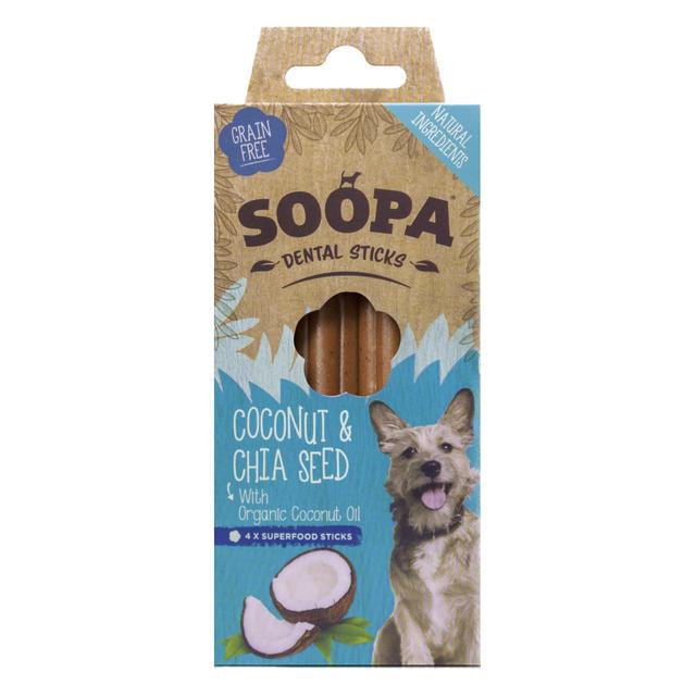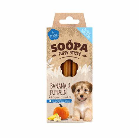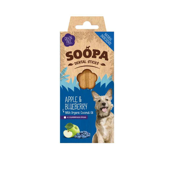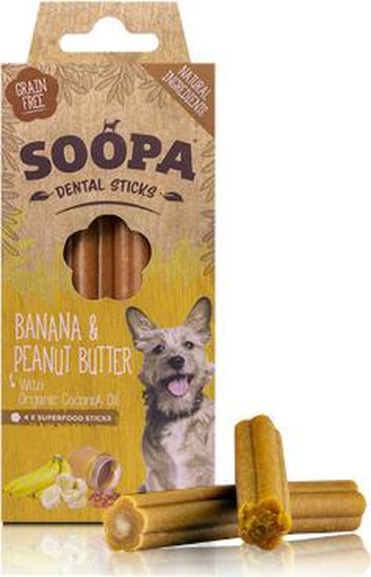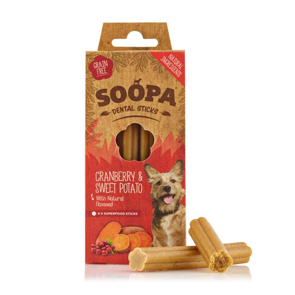 Soopa Dental Sticks are a hypoallergenic grain free treat for the dog that loves to chew. Made using natural 100% human grade ingredients they help keep teeth clean and improve doggie breath. Bursting with vitamins, minerals & health benefits. Simple, delicious, nutritious and best of all dogs LOVE them!