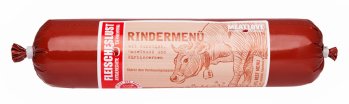 80% beef meat and innards (30% beef meat, 25% beef rumen, 15% beef lung, 6% beef heart, 4% beef liver), 12.1% zucchini, ground hazelnut, ground pumpkin seeds, sunflower oil, sea salt, eggshell powder, mineral earth, yucca root extract