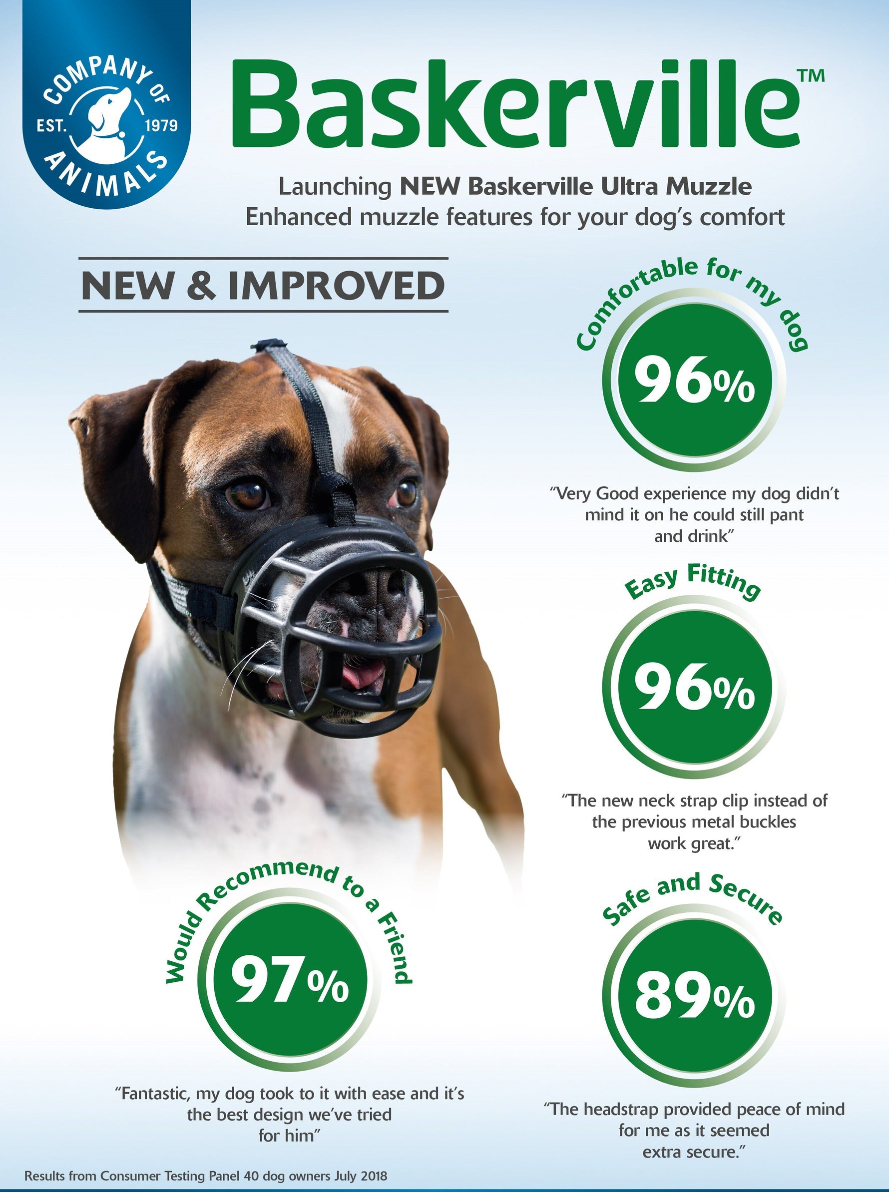 The Baskerville Ultra Muzzle provides a dog owner with peace of mind and reassurance in all situations. Today, dog owners use muzzles for as variety of reasons and the Ultra Muzzle ensures your dog is comfortable at all times even when the wearing the muzzle for extended period such as daily walks.   The Ultra Muzzle is safe and secure in a wide variety of situations including visits to the vet or groomer, travelling on public transport, to prevent wildlife scavenging and when socialising reactive or aggressive dogs.