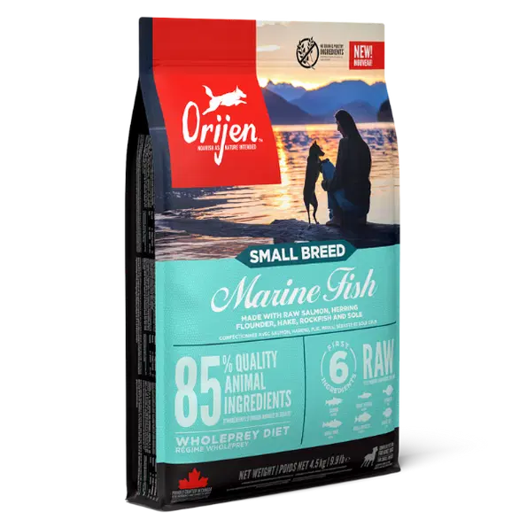 Help your dog thrive with the power of protein-rich recipes that provide peak nourishment. Dogs are ancestral carnivores, so they need a Biologically Appropriate diet rich and varied in whole animal ingredients. ORIJEN Small Breed Marine Fish helps support unique health benefits that help small breed dogs thrive. Packed with 85%2 quality animal ingredients like raw salmon and herring. With WholePrey animal ingredients like organs and bone, ORIJEN food is made with the most nutrient-dense, succulent parts of the prey to deliver the nutrition dogs need. The result is a diet for your canine companion that is beyond comparison.