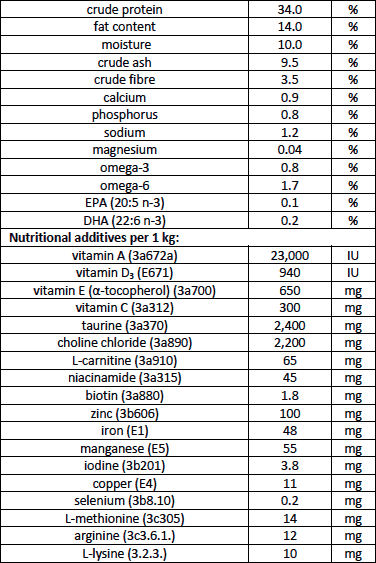 Serve dry or slightly moistened with lukewarm water or bouillon three times per day as a daily feeding ritual. The recommended daily serving size is shown in the feeding table and may vary depending on your cat’s age and activity level. When feeding Carnilove to your cat for the first time, mix it with the previous food and gradually increase the proportion of new food over the course of seven days. Make sure your cat always has plenty of fresh water.