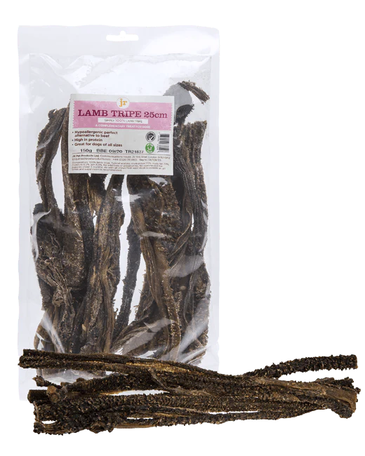 These delicious Lamb Tripe 25cm is made from 100% Air dried Lamb Tripe. Hypoallergenic, so great for those with allergies or sensitivities but still rich in Nutrients, High in Protein and Low in Fat as traditional Tripe. This highly palatable and easily digestible treat makes it a great reward or training treat for all ages, including more Senior Dogs. Our Lamb Tripe is naturally packed with Vitamins and Minerals including Omega 3&6 fatty acids which help boost your dog's immune system, reduce joint inflammation and helps produce a healthy skin and coat so you know they're getting the very best.