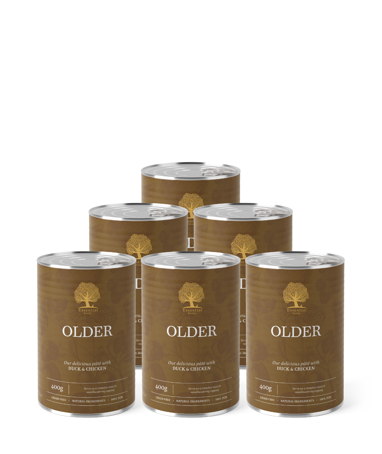 ESSENTIAL OLDER PÂTÉ is our delicious pâté with meat pieces of duck and chicken, tailored to the needs of older dogs. A complete meal or a mouthwatering topping that supports gentle digestion – something that seniors often appreciate.