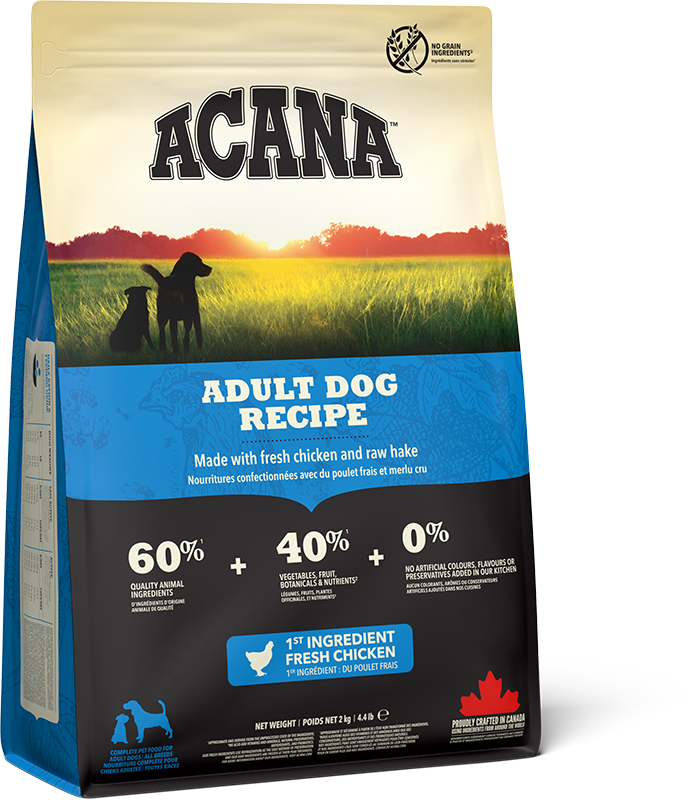 When it comes to ACANA's dog food, every wag and woof matters. That's why their Adult Dog Recipe is a masterpiece, meticulously tailored to cater to the needs of dogs of all shapes and sizes. Bursting with a generous 60%* of premium animal ingredients like fresh Canadian chicken and raw flounder, harmoniously balanced with 40% fruit, vegetables, and botanicals, this recipe is the epitome of canine culinary excellence. With each meal brimming with the goodness of quality animal proteins and farm-fresh produce, it's like a gourmet feast straight from the farmer's market. Featuring fresh Canadian chicken as the star ingredient, preserved using only refrigeration for maximum freshness, and proudly crafted in Canada, this recipe is a testament to ACANA's commitment to quality and canine well-being. Plus, with no grain ingredients**, your furry companion can enjoy every bite with boundless tail-wagging delight.