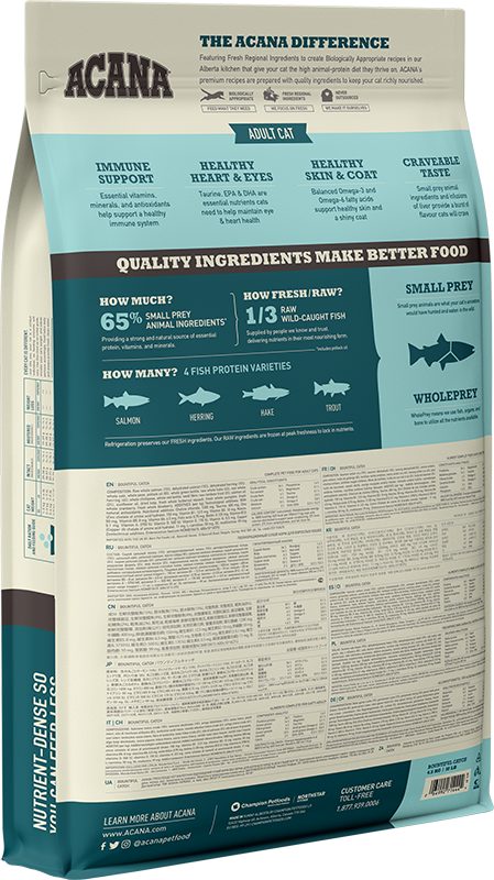 Feed your little wildcat a diet packed with whole fish ingredients. NEW ACANA Bountiful Catch is loaded with quality fish ingredients from wild-caught salmon & herring, and rainbow trout, in richly nourishing WholePrey ratios of fish, organs, and bone, so your cat is getting the nutrients they need, naturally.