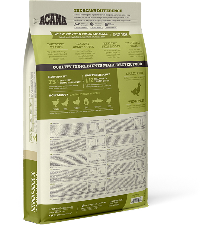 Cats require a diet rich in animal protein. Inspired by vast grasslands and cold northern lakes, ACANA Grasslands is brimming with free-run chicken, turkey, and duck, cage-free eggs, and wild-caught fish, in WholePrey ratios of meat, organs, cartilage, and bone. Our ingredients are delivered to our kitchen fresh or raw by people we know and trust, giving your cat the best ingredients and a recipe that will keep them happy, healthy, and strong.