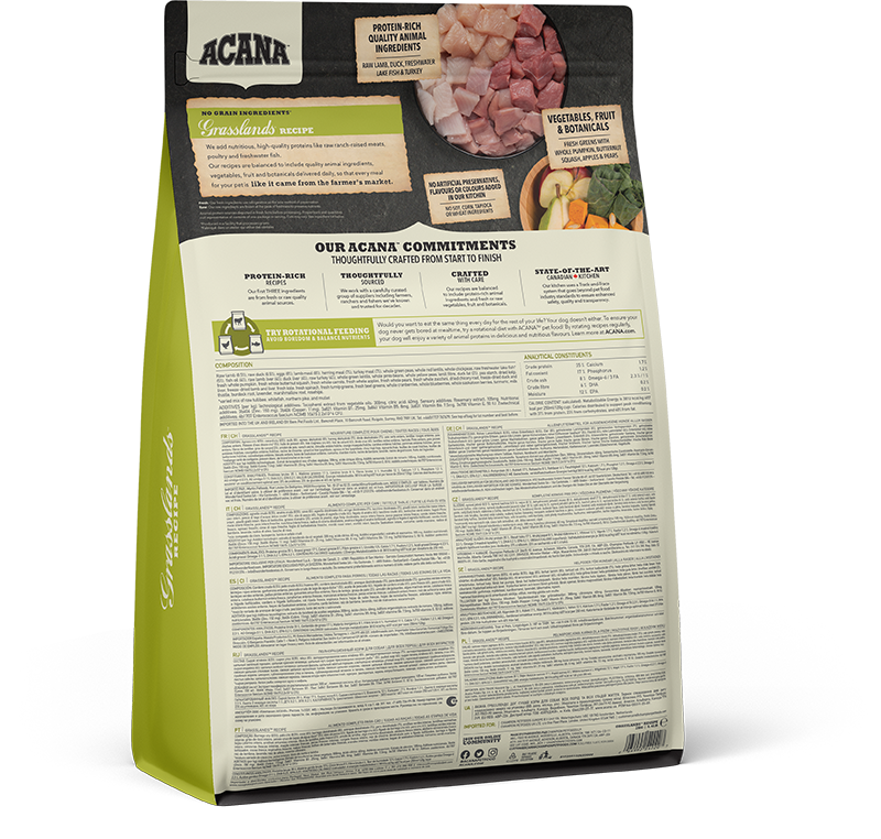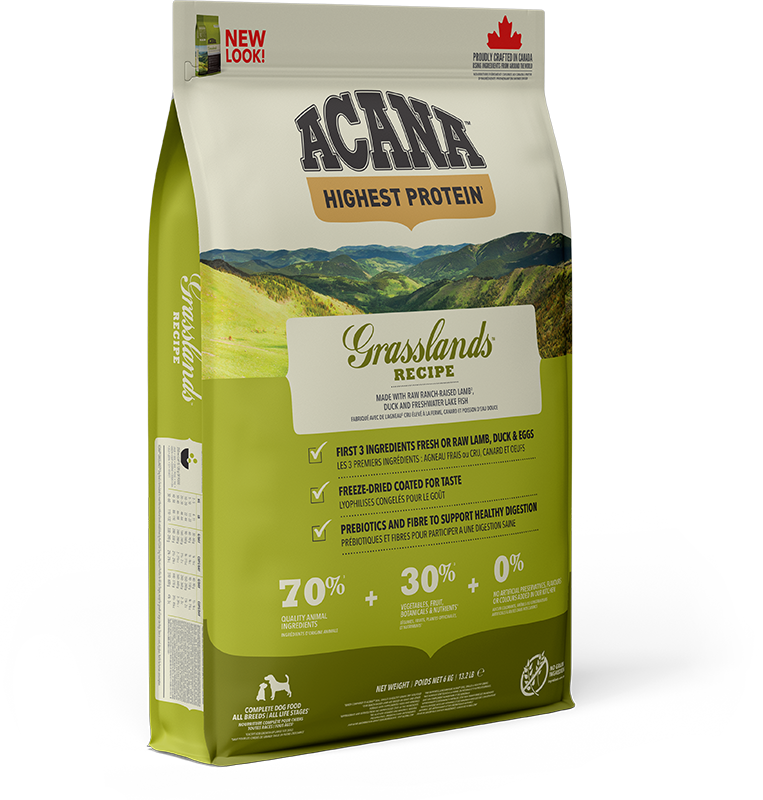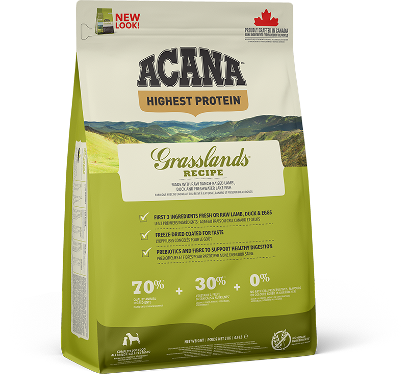 Drawing inspiration from the sprawling grasslands and chilly northern lakes, ACANA Grasslands is a symphony of flavours featuring lamb, duck, eggs, and freshwater lake fish – a veritable feast fit for a four-legged monarch. Sourced fresh or raw by trusted hands we know, each ingredient is handpicked to ensure top-notch quality, delivering nothing short of canine culinary excellence to your furry friend's bowl. With our commitment to freshness, using refrigeration to preserve our fresh ingredients and freezing our raw ingredients at their peak, your pup gets a taste of pure, untamed goodness in every mouthful. So, if you want your canine companion to strut around the park with the vigour of a Highland stag, look no further than ACANA Grasslands – because every tail wag tells a tale of true taste sensation.