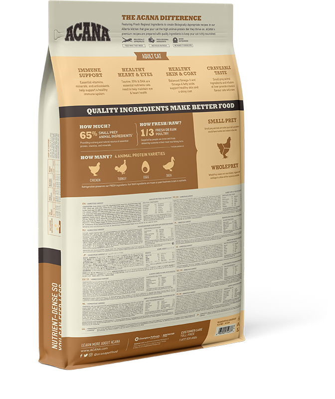 Feed your little wildcat a diet packed with quality animal ingredients. NEW ACANA Homestead Harvest is packed with free-run chicken, turkey, and duck, in WholePrey ratios of poultry, organs, and cartilage, nourishing your cat naturally while offering a taste they crave, and keeping them healthy, happy, and strong.