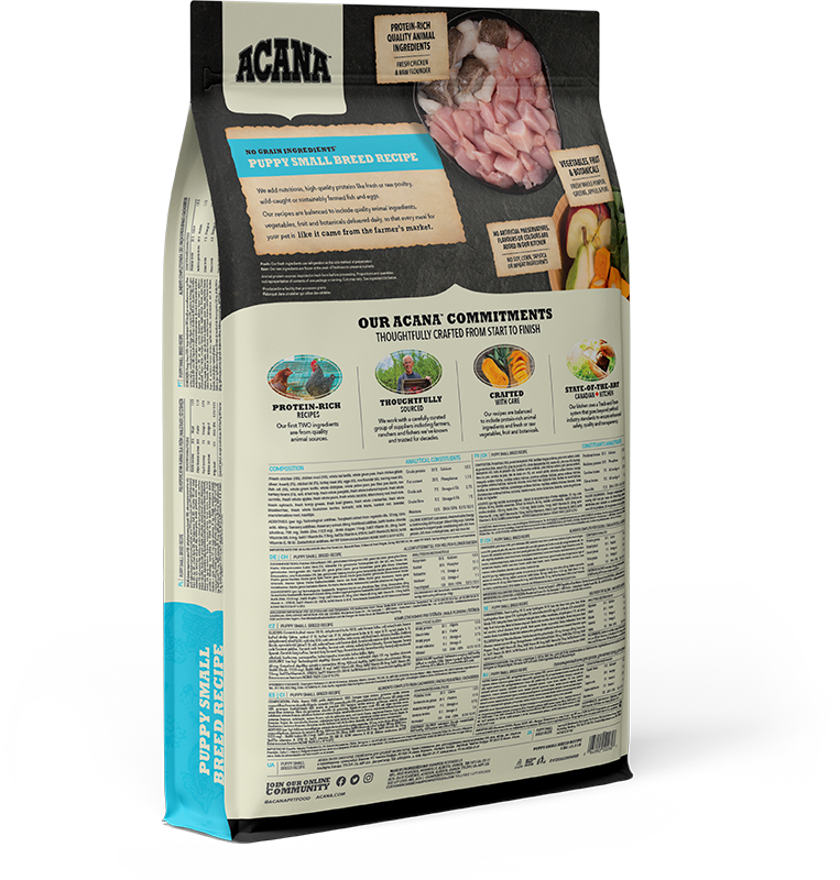 ACANA Puppy Small Breed features an unmatched variety of local ingredients that are raised or fished by people we know and trust, deemed “fit for human consumption”, and then delivered to our award-winning kitchens fresh each day!