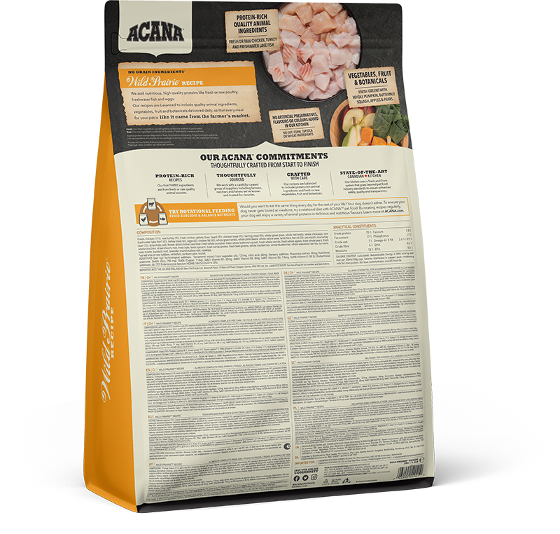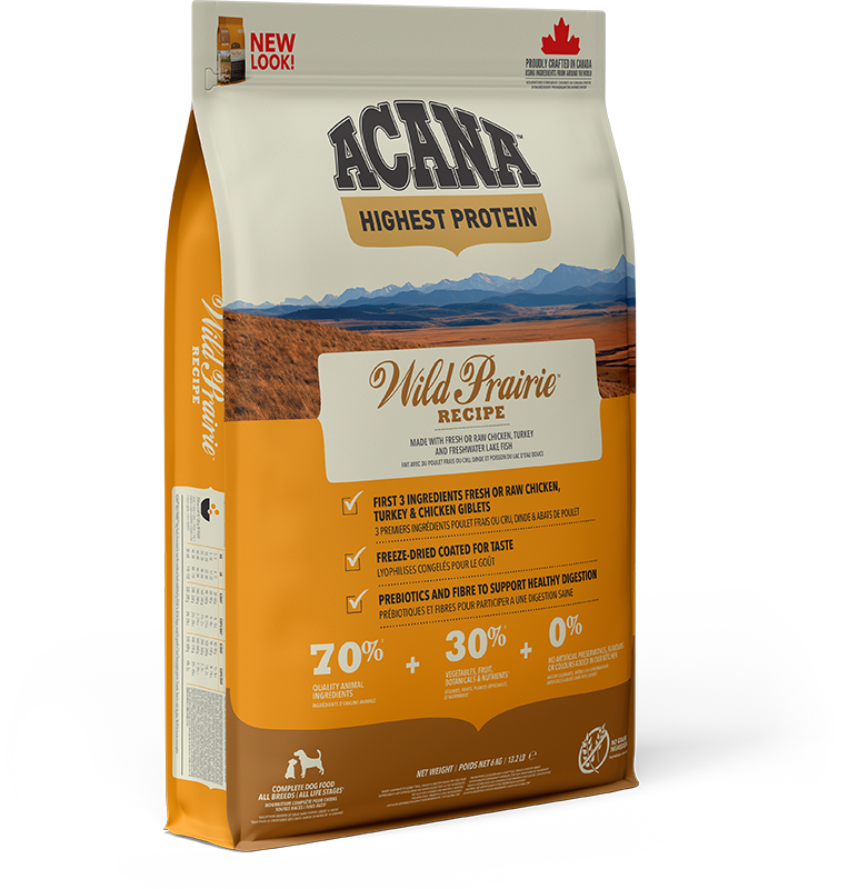 Welcome to the wild, wonderful world of ACANA Wild Prairie, where a tantalising array of local ingredients handpicked by trusted hands, certified "fit for human consumption", and whisked to our NorthStar® kitchens quicker than a hare darts across the prairie each day! ACANA Wild Prairie showcases a quintet of meats in WholePrey™ ratios, ensuring your four-legged friend receives a veritable banquet of nutrients straight from the heart of Canada. From free-run chicken, bursting with clucky goodness from local farms, to free-run turkey as plump as a harvest moon, and nest-laid eggs as fresh as a crackling dawn, each ingredient is a testament to quality and tradition. And let's not forget the wild-caught walleye and trout, sourced from Canada's pristine lakes, ensuring every bite is a taste of true Canadian wilderness. So, if you want your pooch to frolic with the spirit of the wild, it's time to treat them to a taste of ACANA Wild Prairie – because every bark tells a tale of culinary excellence.