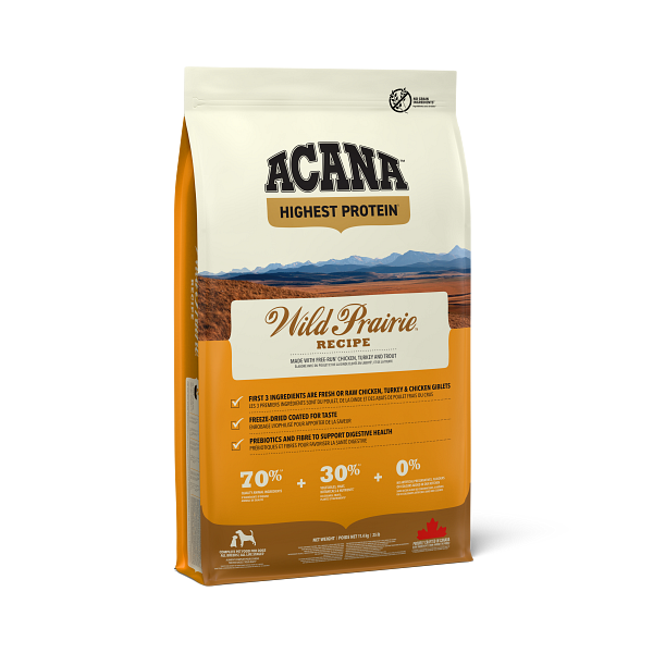 Welcome to the wild, wonderful world of ACANA Wild Prairie, where a tantalising array of local ingredients handpicked by trusted hands, certified "fit for human consumption", and whisked to our NorthStar® kitchens quicker than a hare darts across the prairie each day! ACANA Wild Prairie showcases a quintet of meats in WholePrey™ ratios, ensuring your four-legged friend receives a veritable banquet of nutrients straight from the heart of Canada. From free-run chicken, bursting with clucky goodness from local farms, to free-run turkey as plump as a harvest moon, and nest-laid eggs as fresh as a crackling dawn, each ingredient is a testament to quality and tradition. And let's not forget the wild-caught walleye and trout, sourced from Canada's pristine lakes, ensuring every bite is a taste of true Canadian wilderness. So, if you want your pooch to frolic with the spirit of the wild, it's time to treat them to a taste of ACANA Wild Prairie – because every bark tells a tale of culinary excellence.